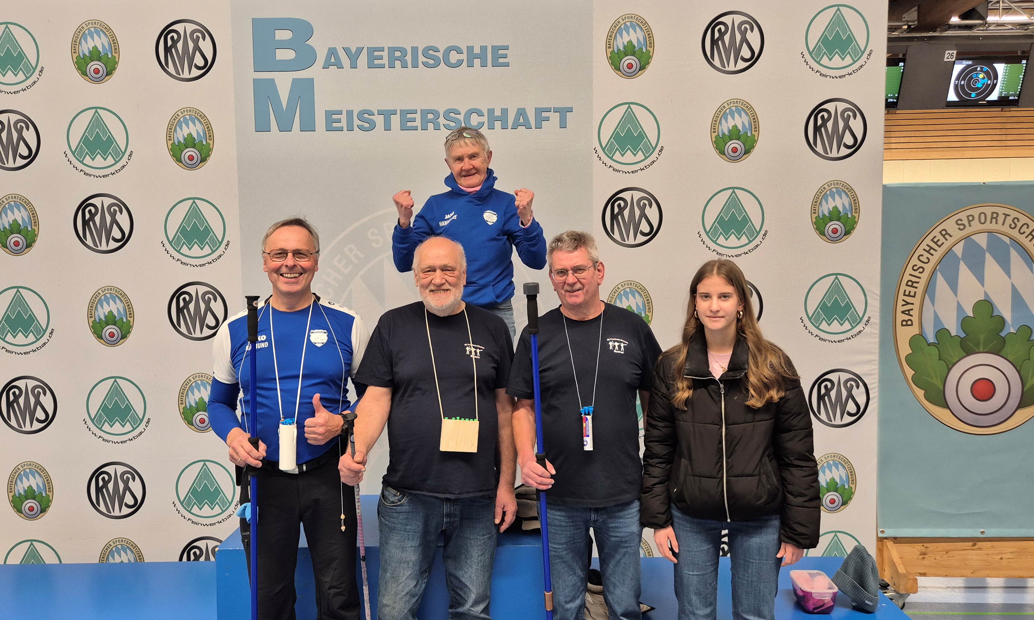 Wo ist der Raimund, wir fallen uns über die Füße bei dem Gewusel, wo ist der Engelhart, der steht noch in Garching und kein Taxi in Sicht. Endlich mit dem Bus, direkt vor die Schießanlage, und ein paar Schritten zur Halle, wars dann schon Spitze auf Knopf, als er ankam! Wie gut, dass wir sein Equipment schon in die Halle mitgenommen hatten, denn es erfolgte noch die Anmeldung und Blasrohrkontrolle! Noch ein paar Fotos gemeinsam, auch wenn wir nicht bayrische Meister werden, natürlich unter dem Emblem der „Bayerischer Meister“. Schließlich ging es auch um die Qualifizierung zur Deutschen Blasrohrmeisterschaft!