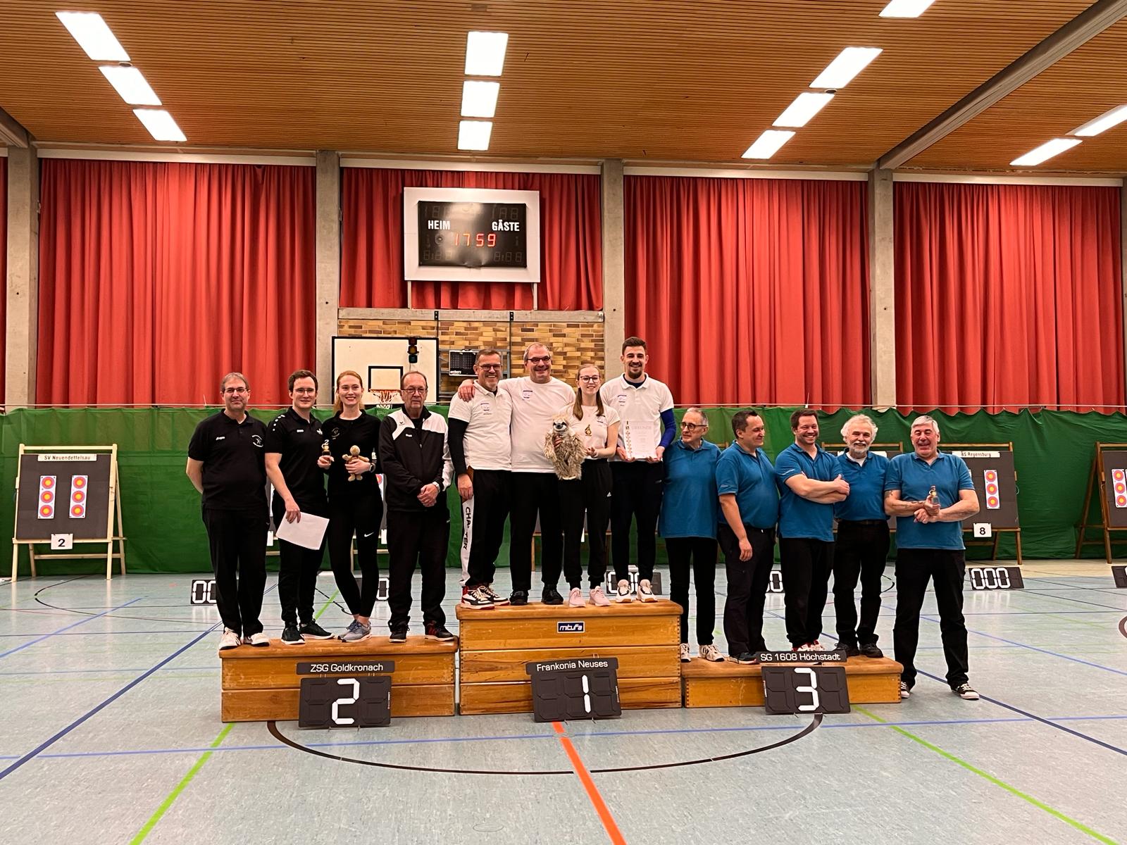 Am ersten Wettkampftag am 13.01.2024 in Eggolsheim konnte die Mannschaft den Heimvorteil für sich nutzen: Mit sechs gewonnenen Matches und nur einer Niederlage ging die Gruppe mit 12:2 Punkten als erstplatzierte Mannschaft in den zweiten Wettkampftag. Mit der realen Chance zum Aufstieg ging die Frankonia Neuses in den zweiten Wettkampftag am 17.02.2024 in Rehau. Mit guter Laune und ein paar Fans im Gepäck behielten die Schützen die Nerven und zeigten sehr gute Ergebnisse: Auch an diesem Tag gewannen wir sechs Matches und holten uns mit 24:4 Punkten der ersten Platz. Somit machte die Frankonia Neuses an ihrem 65. Gründungsjubiläum den Aufstieg in die Oberliga perfekt.